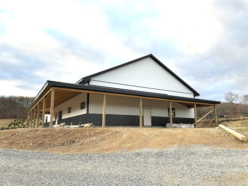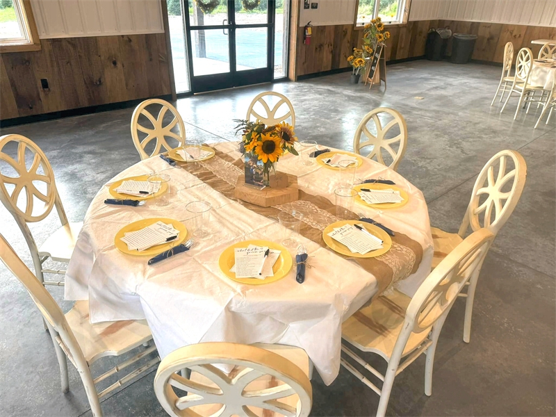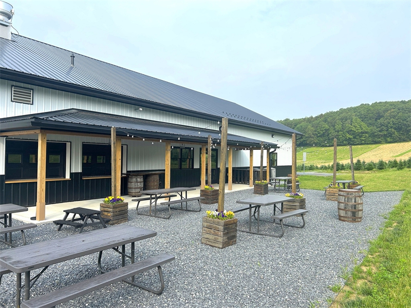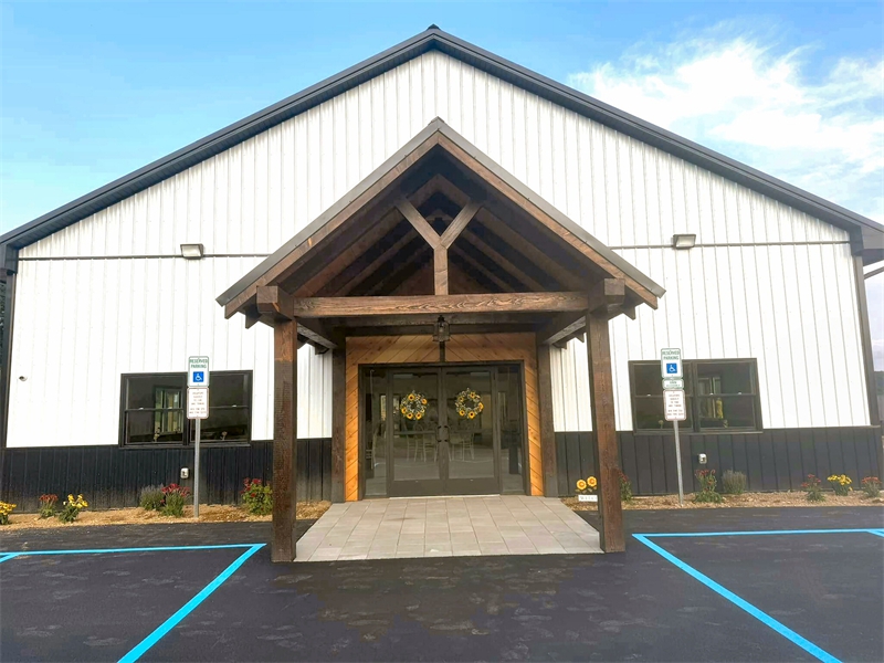 Agritainment building with wrap around open framed porches. The building is used for various public functions that deal with the multiple festivals that take place at Yenser's Tree Farm throughout the year. A large banquet room that can be used for weddings, birthday parties, and other special events. A full commercial kitchen in the building that is able to serve the needs of the multiple functions that take place at the building. The custom timber railings and entryways are made from locally sourced lumber.